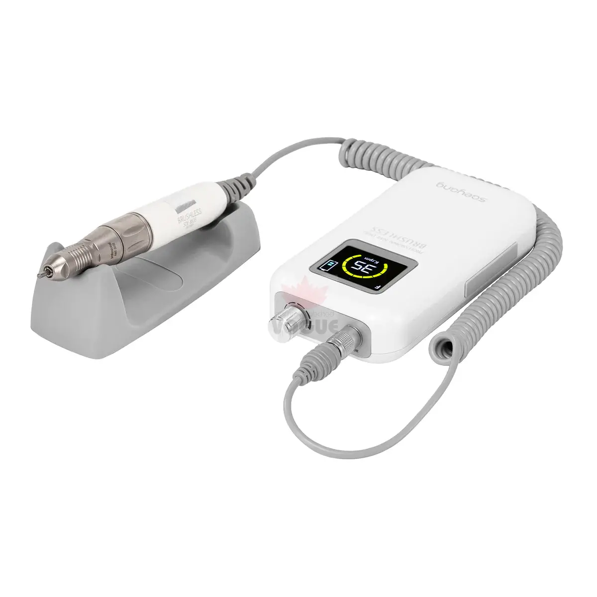 Pomocou gombíka môžete plynulo regulovať rýchlosť hlavice, dosahujúcu až 35 000 otáčok za minútu, čo umožňuje jednoduché prispôsobenie individuálnym potrebám a zaisťuje komfort pri vykonávaní rôznych ošetrení. Stlačenie gombíka vám umožní okamžite zastaviť a znovu spustiť zariadenie (funkcia pauzy), čo vám dáva plnú kontrolu nad pracovným procesom. Praktické tlačidlá umiestnené po stranách umožňujú rýchle prepnutie na nožný pohon a zmenu smeru otáčania, čo ešte viac uľahčuje prispôsobenie zariadenia rôznym službám. Displej zobrazuje informácie o smere otáčania, stave batérie, aktivácii nožného pohonu a aktívnej pauze. Zariadenie je navyše vybavené ochranou proti preťaženiu, ktorá chráni motor pred prehriatím, čím zaisťuje vyššiu prevádzkovú bezpečnosť a životnosť zariadenia.