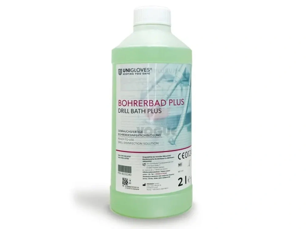 Dezinfekčný kúpeľ pre zubné vrtáky UNIGLOVES BOHRERBAD Plus je samočinne čistiaci dezinfekčný a čistiaci prostriedok na profylaktickú dezinféciu fréz a presné rotujúce nástroje na báze bublín, alkoholov a amínov, špeciálnych rozpúšťadiel a inhibítorov korózie na ochranu materiálu. Zachováva ostrosť na rezných hranách.