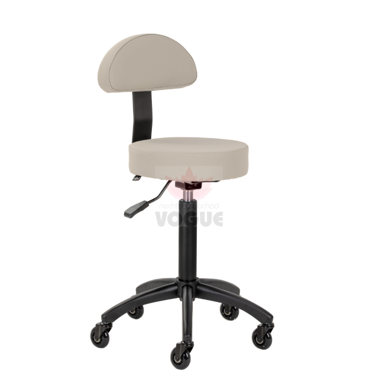 Stolička je umiestnená na päťramennej čiernej základni v polomatnom prevedení, ktorá zaisťuje vynikajúcu stabilitu aj pri intenzívnom používaní.Sedadlo je čalúnené odolnou syntetickou kožou v elegantných sivo béžových tónoch, ktorá je odolná voči vlhkosti, škvrnám a každodennému používaniu. Penová výplň si zachováva svoj tvar aj pri dlhodobom zaťažení. Vďaka modernému estetickému dizajnu táto stolička perfektne zapadne do profesionálnych interiérov. Je to praktická a štýlová voľba pre kadernícke a kozmetické salóny, kde je prioritou pohodlie, pevná konštrukcia a elegantné vybavenie.