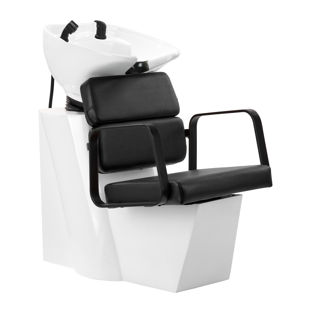 Tvarované kreslo poskytuje dostatočnú bedrovú oporu a zaisťuje vysoký komfort používania. Geometricky tvarované čierne kovové podrúčky umožňujú správne zarovnanie ramien. Odolné, deformačne odolné penové polstrovanie a mäkké čierne syntetické kožené čalúnenie zaisťujú odolnosť, jednoduché čistenie a dlhotrvajúce pohodlie. Jedinečný, elegantný dizajn umývacej stanice dodáva jedinečný nádych každému interiéru. Sada obsahuje všetky čierne armatúry vrátane batérie, sprchovej hlavice a zodpovedajúcich hadíc, čím poskytuje kompletnú sadu nástrojov na danú prácu.