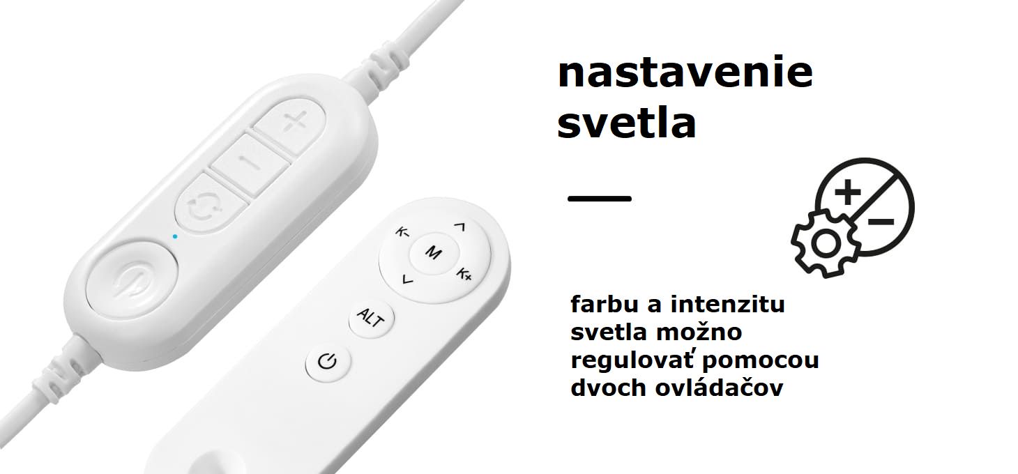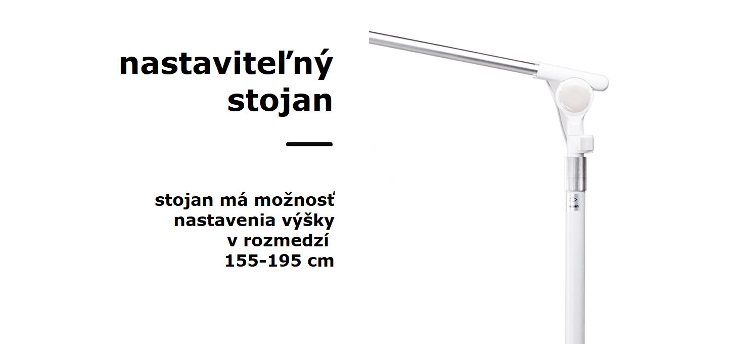 Stojan sa dá ľahko nastaviť v rozsahu 155-195 cm pomocou aretačnej skrutky umiestnenej na ramene. To umožňuje presné nastavenie polohy hlavy individuálnym potrebám používateľa a rôznym typom kozmetických kresiel, pohoviek a ošetrovacích stolov, čím sa zabezpečí optimálne osvetlenie pracovného priestoru. Farbu a intenzitu svetla je možné nastaviť pomocou dvoch diaľkových ovládačov - jeden, umiestnený hneď vedľa lampy, je vždy po ruke a druhý umožňuje diaľkové ovládanie nastavení. Navyše, vďaka vstavanému magnetu sa dá pohodlne pripevniť na zvolené miesto.
