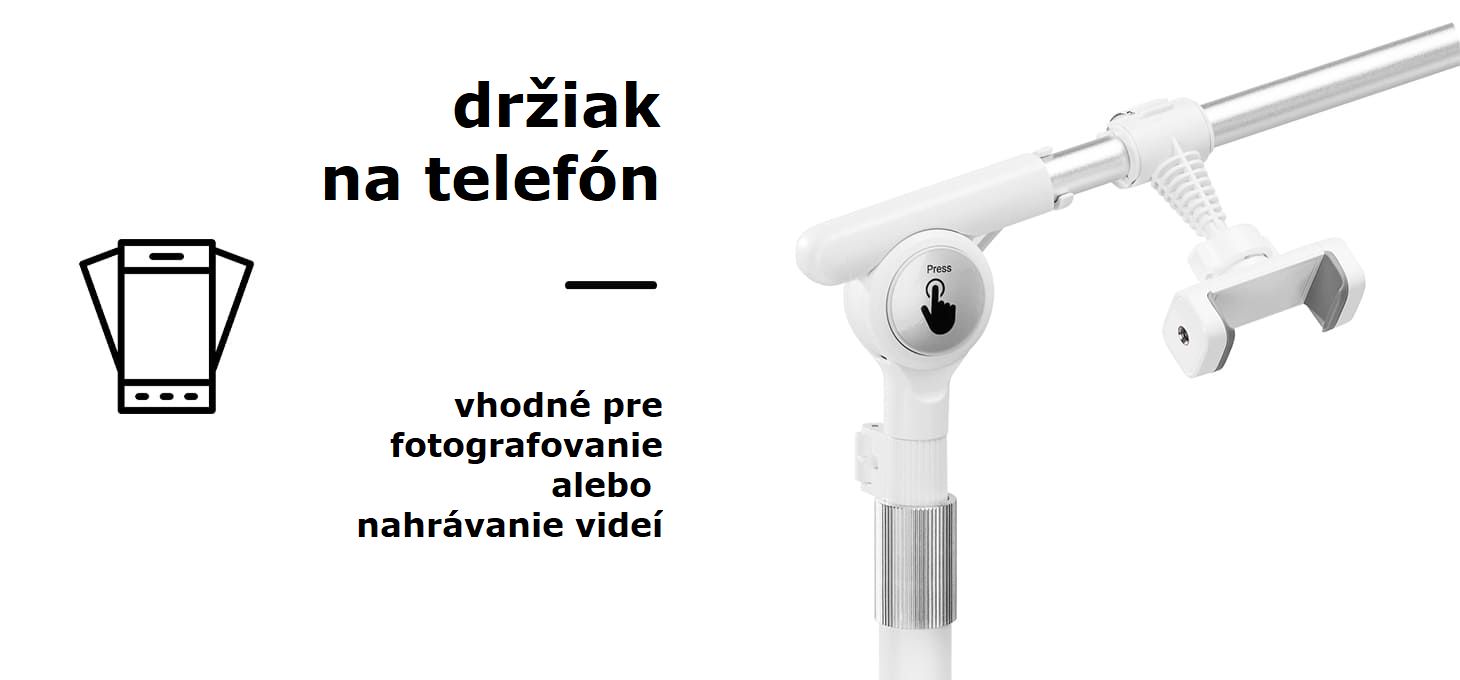 Vrátane balenia: lampa, prvky statívu, podstavec, držiak na telefón, bezdrôtové diaľkové ovládanie, napájací zdroj a napájací kábel, návod.