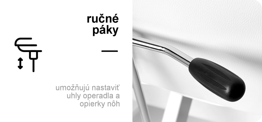 Pomocou špeciálnych pák je možné plynulo nastaviť uhly, v ktorých sú umiestnené opierka nôh a operadlo. To umožňuje optimálne prispôsobiť nastavenia individuálnym potrebám pre správne a pohodlné ošetrenie a pohodlie. Kreslo možno vysunúť až do polohy ležadla, čo výrazne zvyšuje jeho funkčnosť pri ošetrení tváre aj tela.