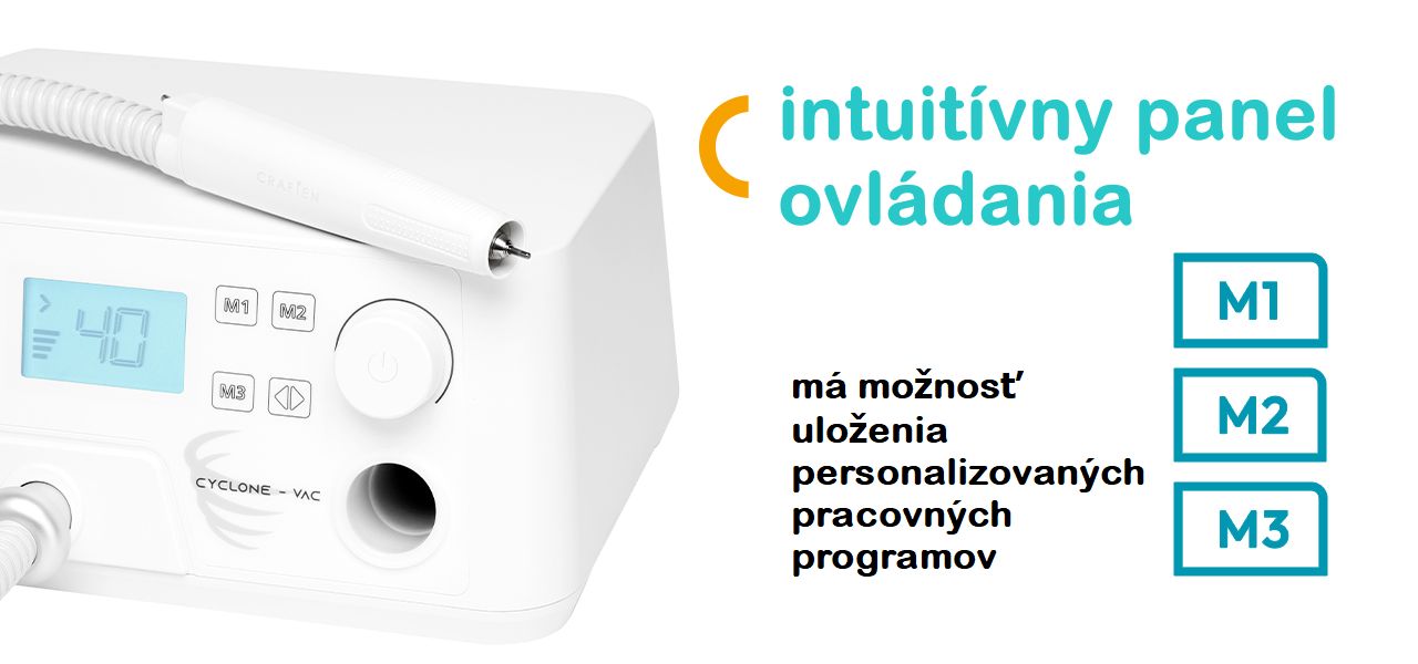 Vhodná ochrana pľúc je kľúčom k zodpovednej a bezpečnej práci pedikéra a dodržiavaniu vysokých hygienických štandardov v ordinácii. Vďaka vysokému saciemu výkonu prístroja dokonale absorbuje všetok prach vznikajúci pri ošetrení. Taktiež je možné nastaviť absorpciu na piatich úrovniach a v prípade potreby túto funkciu deaktivovať.