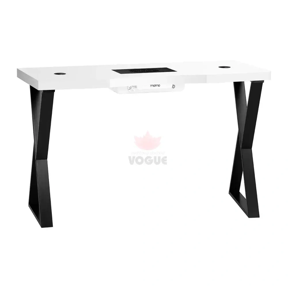 Biely vrch s vysokým leskom a geometrické čierne nohy dodávajú stolu na manikúru moderný a ľahký charakter. Vďaka kompaktnému dizajnu sa stolík hodí do menších aj priestranných interiérov a zároveň zvýrazňuje exkluzívny štýl miestnosti. Tento kozmetický stolík s odsávačom je vynikajúcou investíciou do estetiky a komfortu každodennej práce.