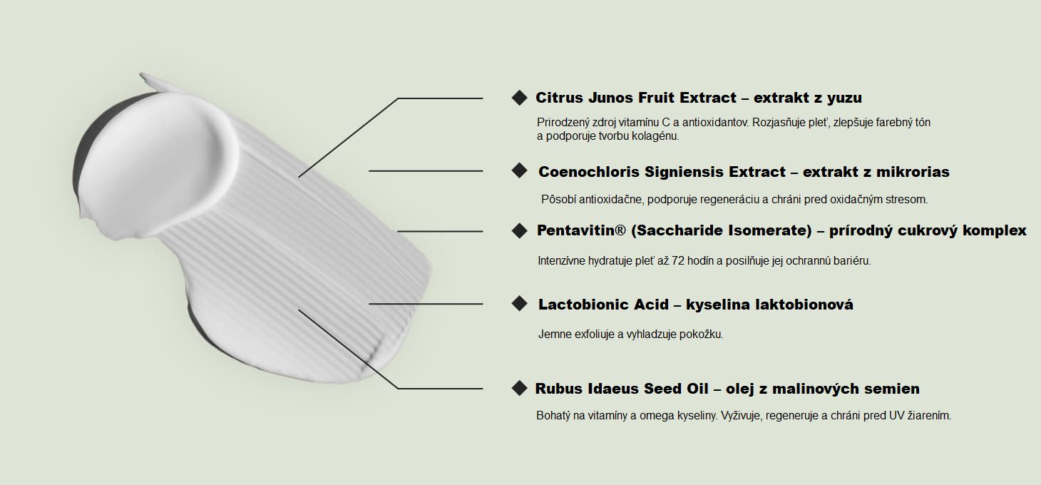 Receptúra krému je obohatená o rastlinné oleje – arganový, slnečnicový, avokádový, malinový a rakytníkový, ktoré podporujú regeneráciu a chránia pokožku pred pôsobením voľných radikálov. Vitamín E zvyšuje antioxidačný účinok, zatiaľ čo kyselina hyalurónová a komplex Pentavitin® zabezpečujú intenzívnu a dlhodobú hydratáciu. Vyhladzujúci a rozjasňujúci efekt poskytujú PHA kyseliny – glukonolaktón a kyselina laktobionová. Extrakty z rias, kiwi, marhule a zázvoru podporujú obnovu pokožky a dodávajú jej svieži a zdravý vzhľad.