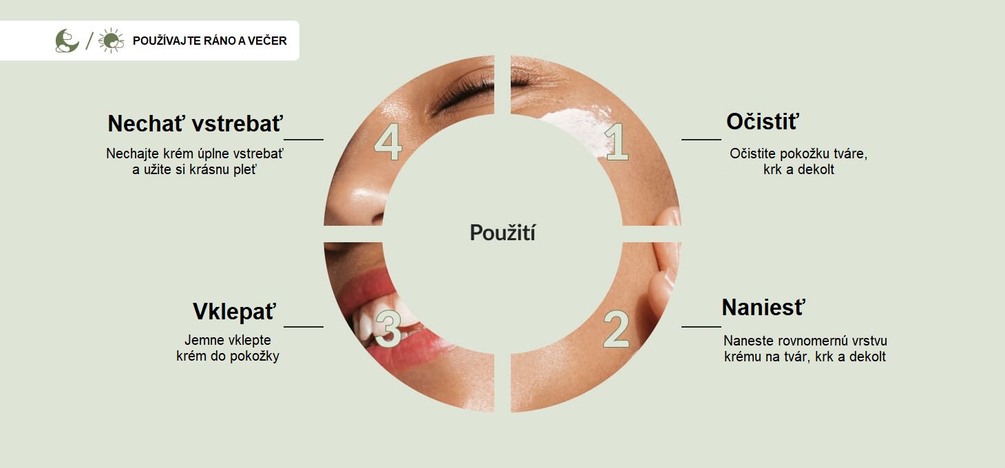 Aplikujte denne ráno a večer na vyčistenú pokožku tváre, krku a dekoltu. Jemne vklepte až do úplného vstrebania.