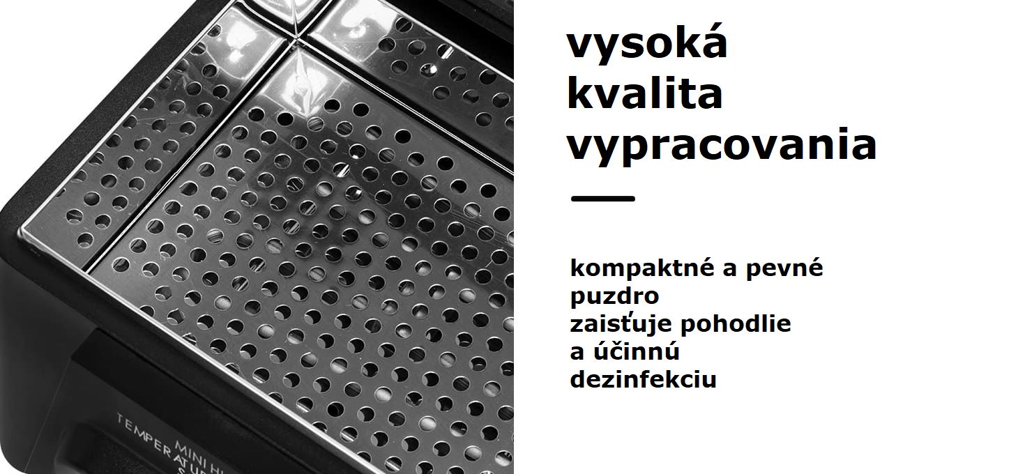 Matný čierny kryt zaisťuje pevnosť a odolnosť zariadenia. Kompaktný dizajn uľahčuje skladovanie a prepravu zariadenia. Vďaka nízkej hmotnosti sa sterilizátor pohodlne používa a zároveň nezaberá veľa miesta v pracovnom priestore. Inovatívny dizajn a pokročilá technológia zaručujú účinnú dezinfekciu nástrojov, čím sa minimalizuje riziko prenosu baktérií a vírusov v kancelárii.